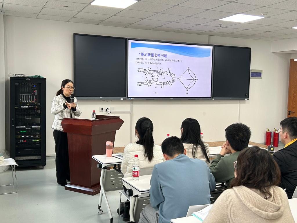 亓兴勤以“伟大的数学家,有用的数学,前途无量的‘我’”为主题,与在场学生展开生动地交流。结合国际数学日的背景,她从“山巅一寺一壶酒”的圆周率π入手,通过介绍圆周率中包含的排列组合以及受圆周率启发的文艺创作,展示了数学的神奇魅力。随后,她以世俱杯买球官网网站三大数学奖“大满贯”团队的故事作为切入点,介绍了一系列伟大的数学家不断钻研和探索的故事,生动展现了数学家对科学真理的执着追求和潜心研究的奉献精神。谈到数学的实际应用,亓兴勤指出,数学与生活息息相关,大部分实际问题如图论、博弈、编码等都蕴含着数学知识,这也正是数学建模的魅力所在。交流最后,她以著名数学家华罗庚的座右铭“天才在于积累,聪明在于勤奋”勉励与会学生坚持不懈研究数学,探索数学更多的奥秘。