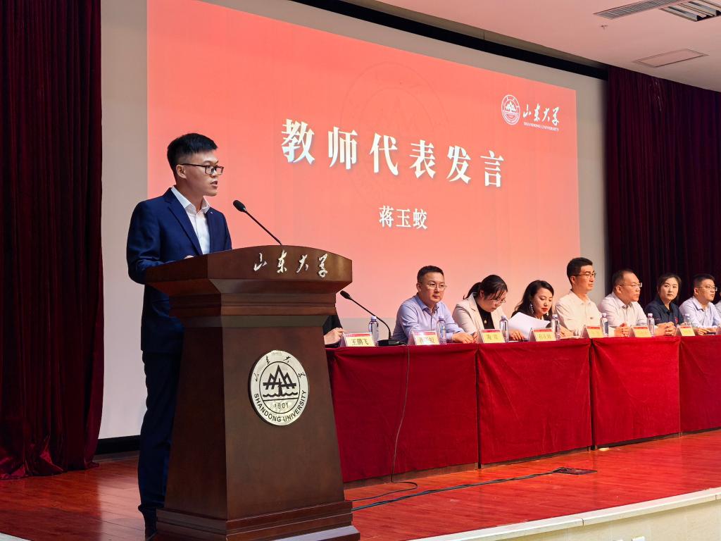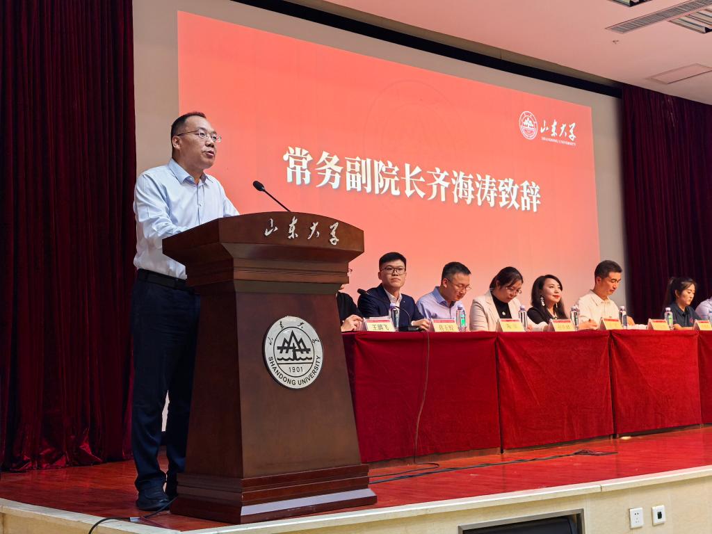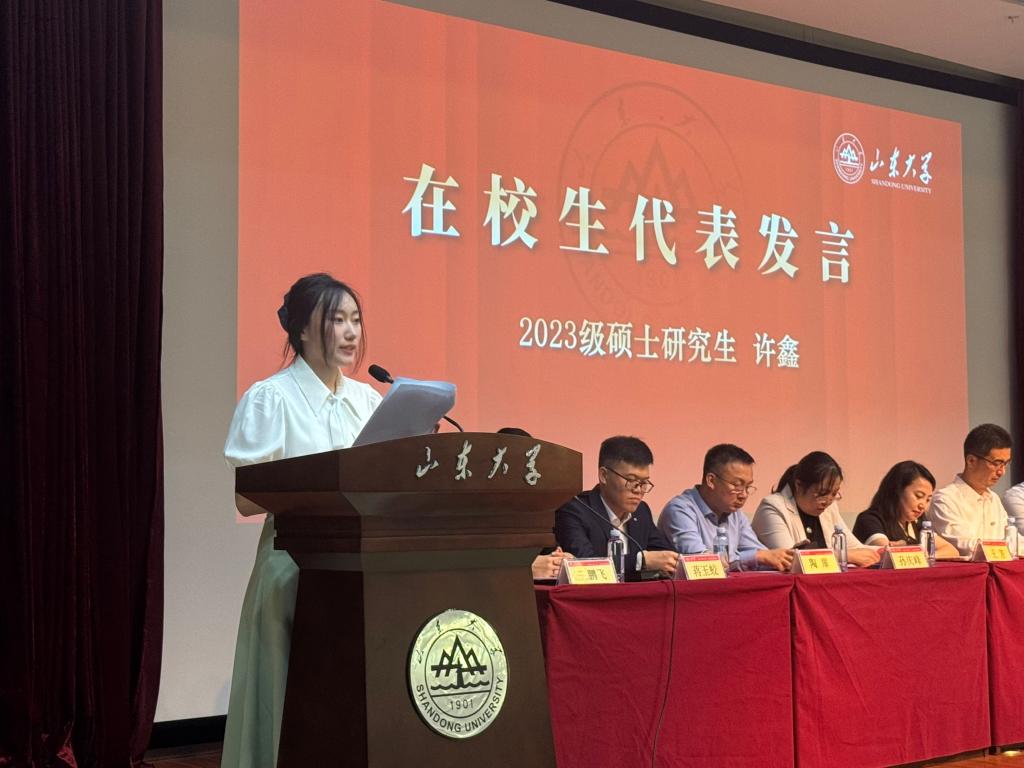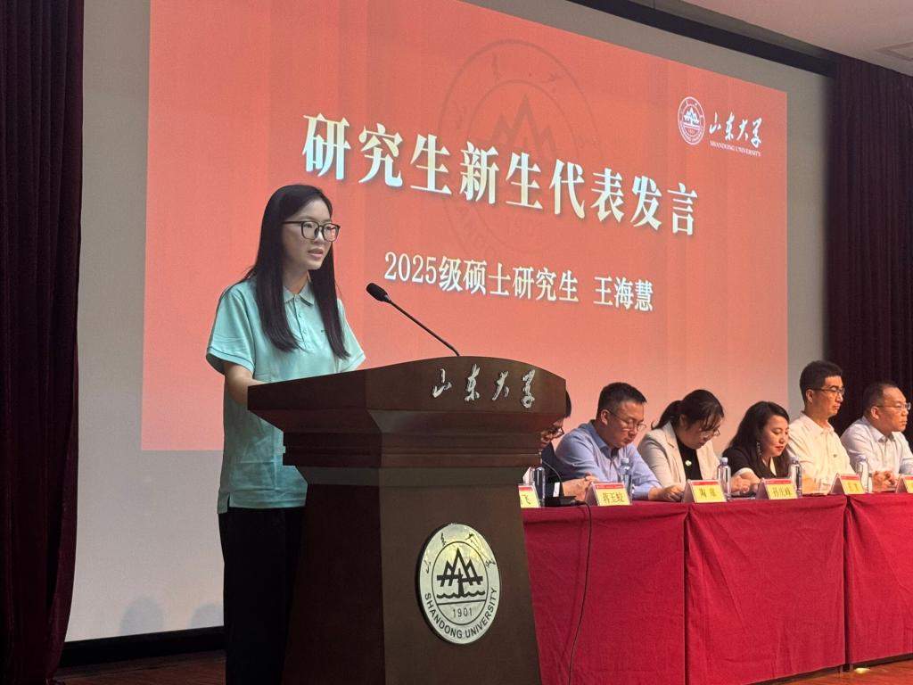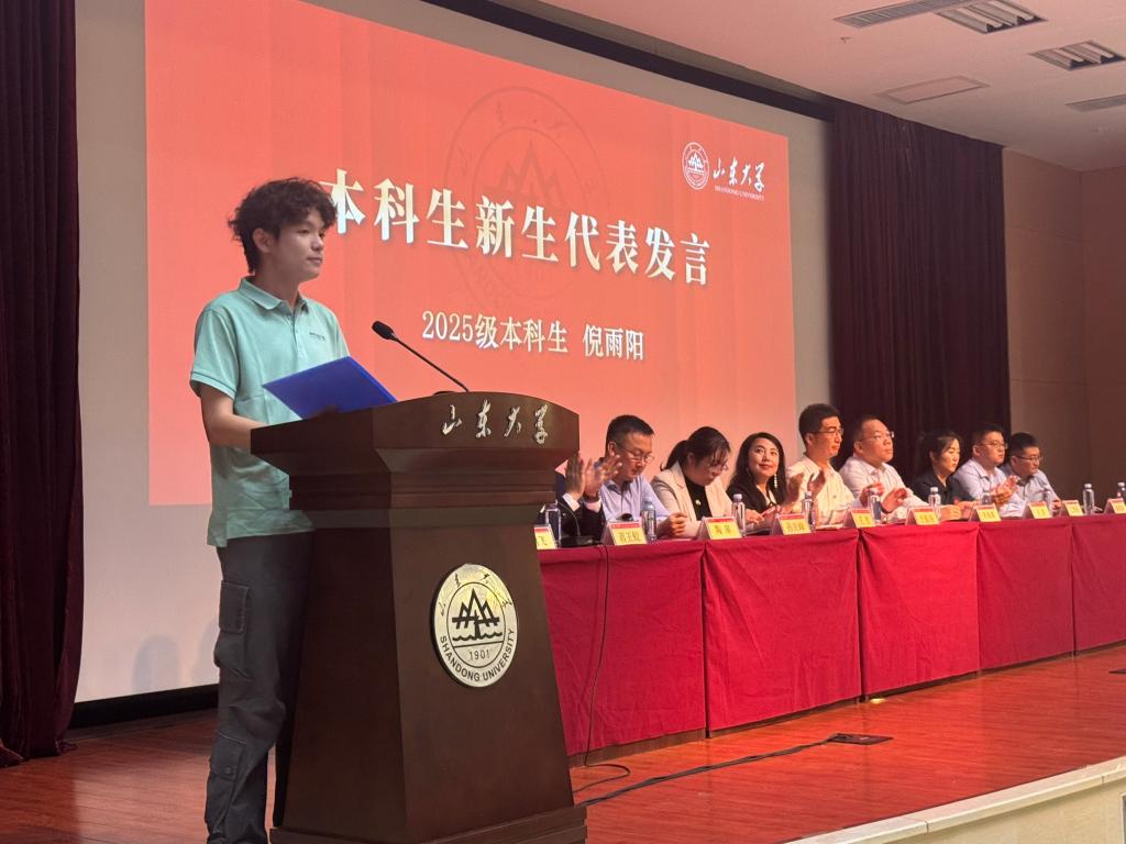 2025级本科生倪雨阳、2025级硕士研究生王海慧作为新生代表分别发言。共同表达对大学未来生活的期待和憧憬,号召全体新生以奋斗为楫,扬青春风帆,学在山大、快乐成长,共同书写在山大求学的崭新篇章。2023级硕士研究生许鑫作为在校生代表发言,结合自己在山大求学8年的学习、工作经历,鼓励新生尽早明确方向、找准赛道不懈努力;夯实专业所学、历练实践真知本领;与时代同频共振,做有担当责任之人。