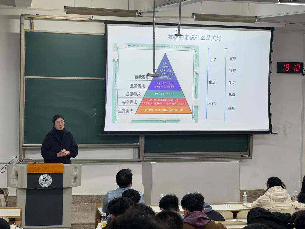 讲座伊始,王鹏飞引用习近平总书记“人民对美好生活的向往,就是我们的奋斗目标”这一论述,结合马斯洛需求层次理论,深入剖析了宿舍作为大学生“第二个家”的多重功能。