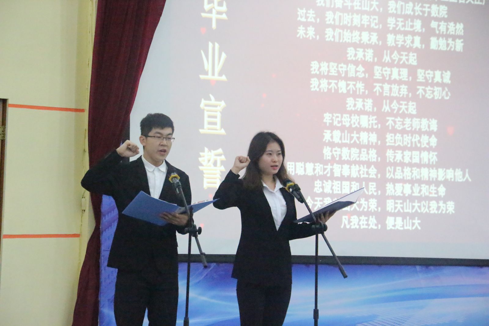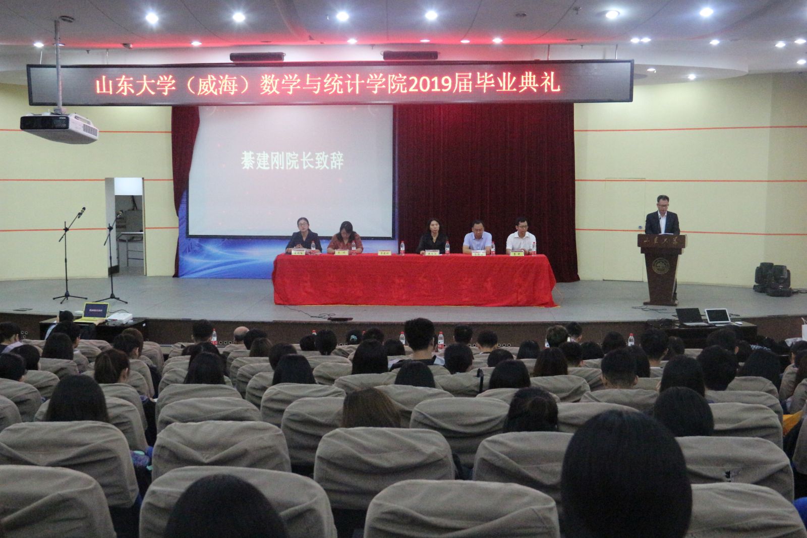 毕业典礼上,全体起立奏唱国歌。綦建刚院长致辞,他对2019届毕业生完成学业表示祝贺,肯定了毕业生取得优异成绩。同时,綦院长对毕业生提出了三点期许:保持一份进取之心,脚踏实地,追求卓越;坚守一份责任之心,甘于奉献,勇于担当;保有一份包容之心,海纳百川,有容乃大。统计系王效强作为教师代表发表讲话,他祝贺毕业生顺利完成学业的同时,表达了对大家的祝福,希望毕业生在未来能保持学习的热情,甘于奉献,踏实勤恳,勇担山大数学人的时代责任。随后,毕业生代表2015级统计专业曹继中上台发言,她和同学们分享了自己大学四年的感触与收获,表达了对母校、学院以及老师同学们的感激之情,表示定将不负母校的嘱托,始终以“学无止境、气有浩然”为精神指引,勇做新时代的弄潮儿。在校生代表2016级数学与应用数学专业张敏发言,她对学长学姐在校期间的悉心帮助表达了感谢,表示在校生会以学长学姐为榜样,对理想不懈追求,争当时代先锋。典礼上,单丙波宣读了山东省和世俱杯买球官网网站优秀毕业生名单,学院领导为省级优秀毕业生、校级优秀毕业生进行颁奖。最后,全体毕业生进行庄严宣誓,奏唱校歌。