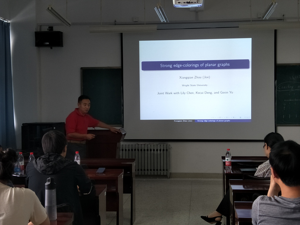 本站讯 2018年6月15日,美国莱特州立大学(Wright State University, USA)数学与统计系副教授周向前应邀访问我院,开展了题为“平面图的强边染色”的学术报告,学院部分师生参加了此次报告。