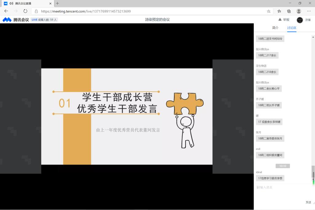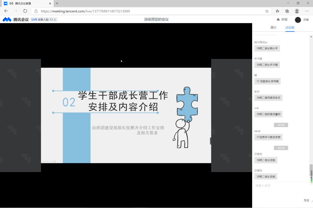 本站讯 2020年11月8日上午,我院通过腾讯会议在线上举行学生干部成长营开营仪式。院党委副书记王鹏飞、辅导员孙磊、王祎璠、王紫山、古钰出席仪式,院学团中心全体成员、17-20级全体班委、宿舍长参加会议。本次会议由曹祎芯主持。
