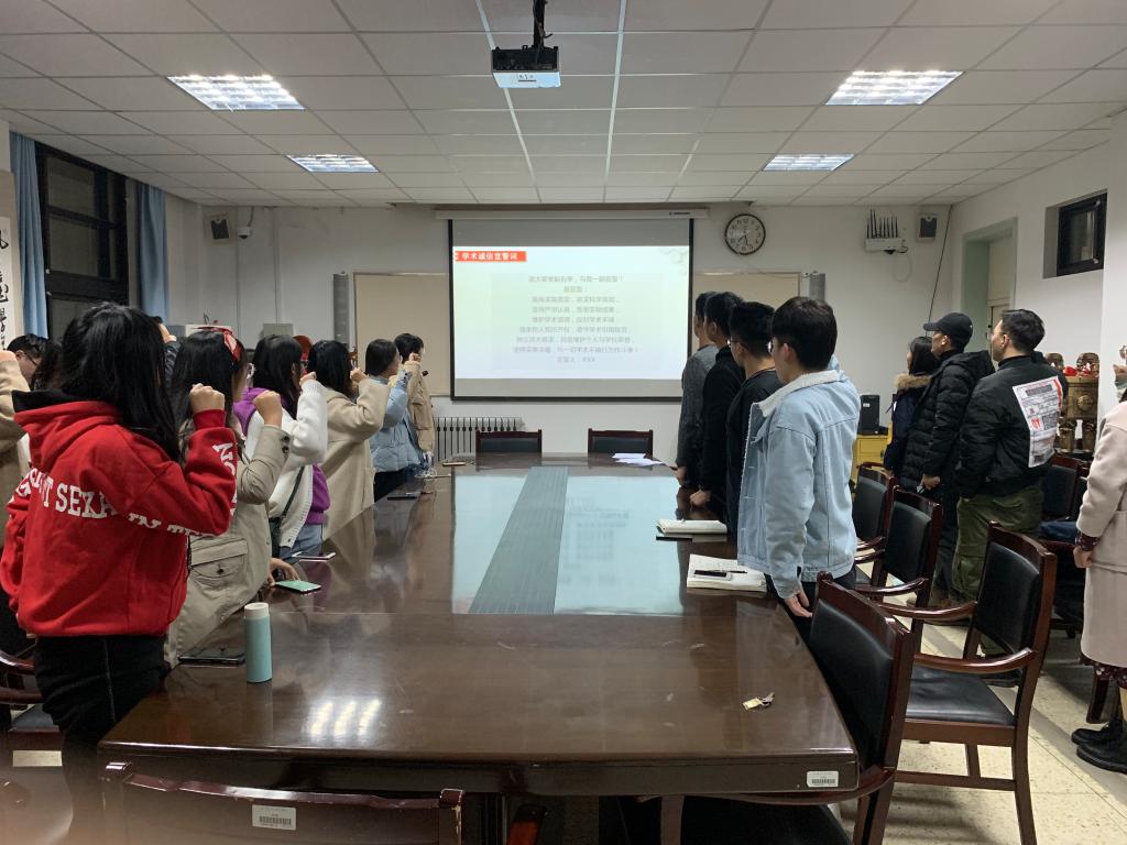 本站讯 11月20日19:00,我院研究生会于图东环楼208举办了以“学术有道,以诚为本”为主题的学术诚信主题班会。本次班会以践行学术诚信、遵守学术道德为准则,力求全体研究生在思想上树立诚信意识,行动上恪守诚信准则。班会由院研会主席王梦冉主持,我院全体研究生参加了此次班会。