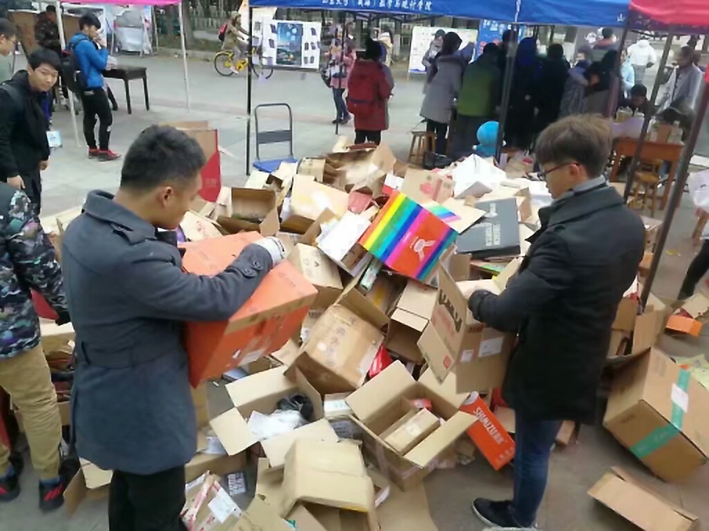本次活动共分为蒙牛广场定点收集、志愿者进宿舍收集以及废旧纸箱的处理三个部分。早上7点30分,定点收集活动准时开始,同学们纷纷把废旧纸箱送至蒙牛广场的摊位,并参与抽奖活动。在提供纸箱、奉献爱心的同时,同学们也获得了一些奖励和惊喜,现场气氛十分热烈。中午11点30分,志愿者们在蒙牛广场集合,并在青年志愿者协会干事们的带领下,有序地进入学生宿舍收集纸箱。在宿舍,同学们积极地配合志愿者们的工作,为纸箱回收活动贡献自己的力量。在收集纸箱的过程中,提供纸箱数目较多的同学获得了志愿者发放的参与卡,也凭借此卡到摊位进行了抽奖。在摊位和宿舍均收集完毕后,志愿者们将收集到的纸箱打包处理好卖给废品回收站,并用所得经费购买小礼品赠送给黄家沟小学的农民工子弟,为孩子们送去一份爱心。至此,“双十一,纸箱有你不孤单”快递纸箱回收活动顺利结束。