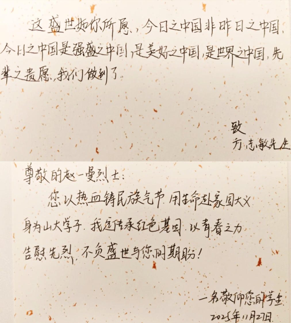 红色家书朗读中,刘泽宇、张荪等同学登台朗诵红色家书,解读家书中的温情。此外,同学们还书写了给抗战英雄的信,以笔为媒搭建起跨越时空的精神对话桥梁。