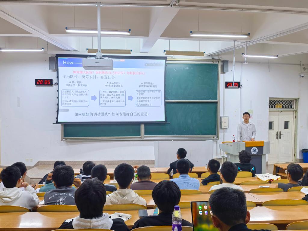 吴博森聚焦“什么是创新大赛?”“为什么我要参加创新大赛?”和“我该如何参加创新大赛?”三问靶向发力,结合自身的科创项目为同学们提供了宝贵经验分享,让同学们更加熟悉了参与创新大赛的全过程。柳宿辰和范少飞从评分细则与侧重点、PPT制作与展示、答辩要点与注意事项三个方面分享了如何更好地呈现科研结果。他们聚焦数理学科特点,结合其他学院的项目展示经验为新生拆解相关要点,帮助新生构建自身科创作品展示框架。