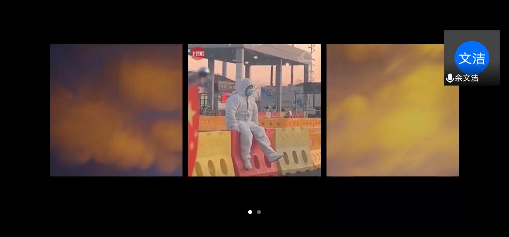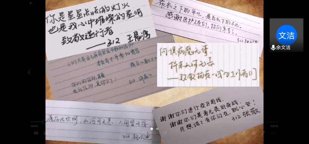 在第二个环节中,同学们一起观看了抗疫纪录片视频,通过视频展示的时间轴与疫情期间的各种信息,了解到了武汉人民的不易、医护人员的伟大、基础建设工人们的辛劳、志愿者的奉献,重新审视了疫情前夕、爆发到逐渐平稳的惊心动魄的抗疫历程。然后,心理委员余文洁将全体同学致敬医护人员而写下的心里话小纸条制作成视频,向同学们播放展示。