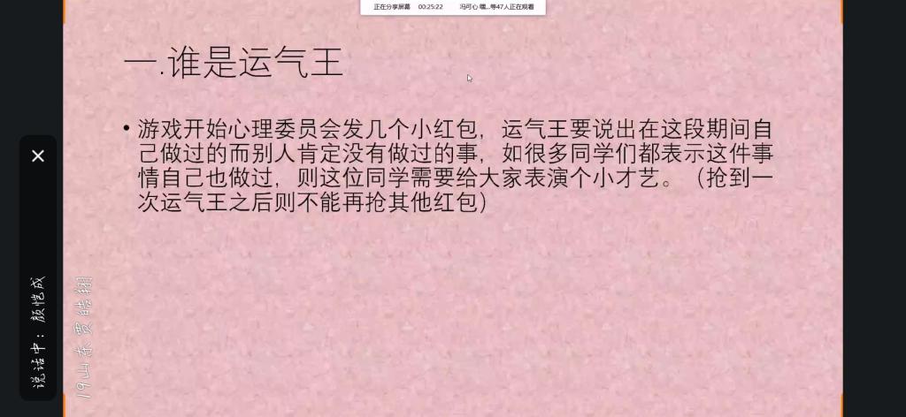 活动伊始心理委员在班级群发了几个小红包,而运气王要说出在这段期间自己做过的但别人肯定没有做过的事,如果很多同学都表示这件事情自己也做过,则这位同学需要给大家表演个小才艺。第二环节为听声辨人,心理委员播放每位同学提前录制的一段十几秒的、内容为自己想对疫情,对生活,对某个人想说的话的视频,让同学们通过听声音来猜出是哪位同学,最先猜对的同学获得神秘奖励。第三环节为我所在地的春天,按照之前分的小组,每组通过制作视频的方式展示自己身边的春天,让同学们足不出户欣赏全国各地春天的美景。第四环节为你画我猜,由心理委员随机选取小组,每组选择一人进行画画,同学们来猜,题目是心理委员精心选取的和同学们息息相关的词语,猜对的同学依然有神秘奖励。最后,由2019级辅导员王祎璠对班会情况及疫情期间同学们存在的疑惑进行讲解,同时还介绍了之后学习安排的有关事项。活动在温馨愉悦的氛围中落下帷幕。