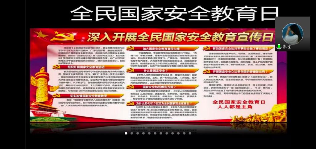 国家安全是国家生存和发展的前提、是人民安居乐业的基础。就此,团支书秦千从国家安全的定义及相关法律规定等各方面向同学们全面介绍了国家安全的有关知识,让国家安全知识入校园。首先,团支书为同学们详细讲解了“什么是国家安全”、“国家安全包括哪些方面”以及国家安全法的规定,旨在让同学们了解更多国家安全的常识。紧接着,团支书又以实际案例向同学们进一步说明国家安全就在我们身边,保护国家安全人人有责。最后,团支书秦千向同学们介绍了作为当代大学生应如何维护国家安全,告诫同学们应自觉履行保护国家秘密、维护国家安全的责任,增强了同学们的责任意识。