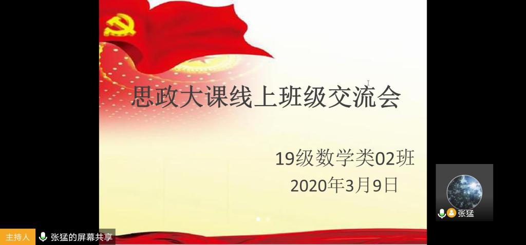 本站讯 2020年3月9日下午,“全国大学生疫情防控思政大课”结束后,世俱杯买球官网网站2019级数学02班通过腾讯会议线上直播,开展了寒假“疫情防控思政大课感悟与总结”主题班会。班长张猛主持此次班会,世俱杯买球官网网站2019级辅导员王祎璠、2班全体同学参加。