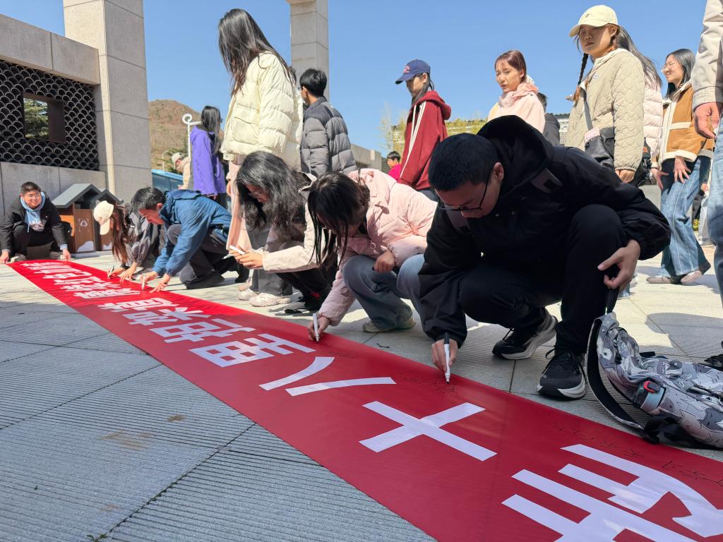 活动最后,全体团员在展馆前整齐列队,举行庄重的缅怀致敬仪式。大家面向鲜红团旗高举右拳,重温入团誓词,誓言铿锵有力、掷地有声,彰显新时代青年坚定不移听党话、跟党走的坚定信念。随后,每位团员写下一句“青春告白”,将担当与承诺汇集成“青春心声”卷轴,在团旗下合影留念,定格青春与信仰同频共振的难忘瞬间,以青春之名赴时代之约,以赤子之心续红色血脉。