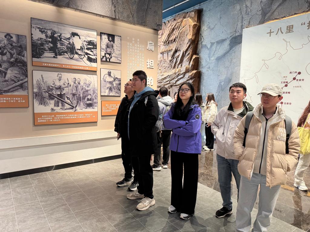 团员们依次走进“扁担的传说和淳朴的情怀”、“十八里浴血担架道”、“人民的信仰”、“英雄无悔”四大展区。历史照片、实物陈列、场景复原生动再现解放战争时期威海保卫战的烽火岁月,里口山群众自发组成担架队,用扁担、被褥搭起简易担架,冒着炮火翻越十八里山路,为伤员搭建起生命通道的英雄壮举深深震撼着每一位同学。大家驻足凝视,重点学习青年妇女队不畏艰险、勇挑重担的感人事迹,深刻感悟“军民鱼水一家亲、党群同心向复兴”的精神内核,在历史与现实的交汇中接受深刻的精神洗礼。